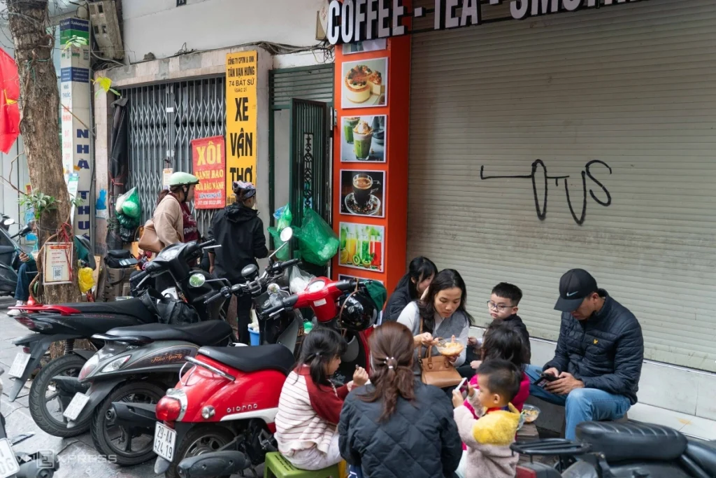 Hàng xôi có tuổi đời hơn 40 năm nằm ở góc vỉa hè trên phố Bát Sứ. Khi Hà Nội chưa đẩy mạnh chấn chỉnh trật tự đô thị, khách thường ngồi kín một đoạn vỉa hè. Hiện, chủ quán thu dọn gọn, chỉ còn góc nhỏ đủ 3-4 nhóm ngồi ăn cùng lúc.